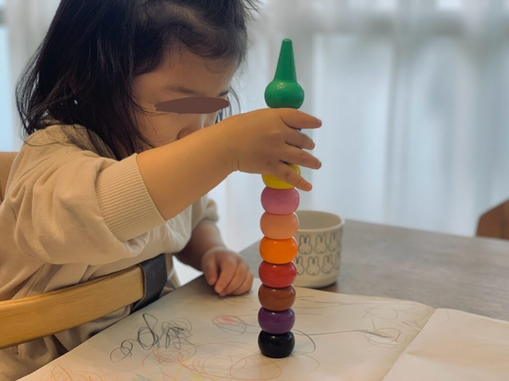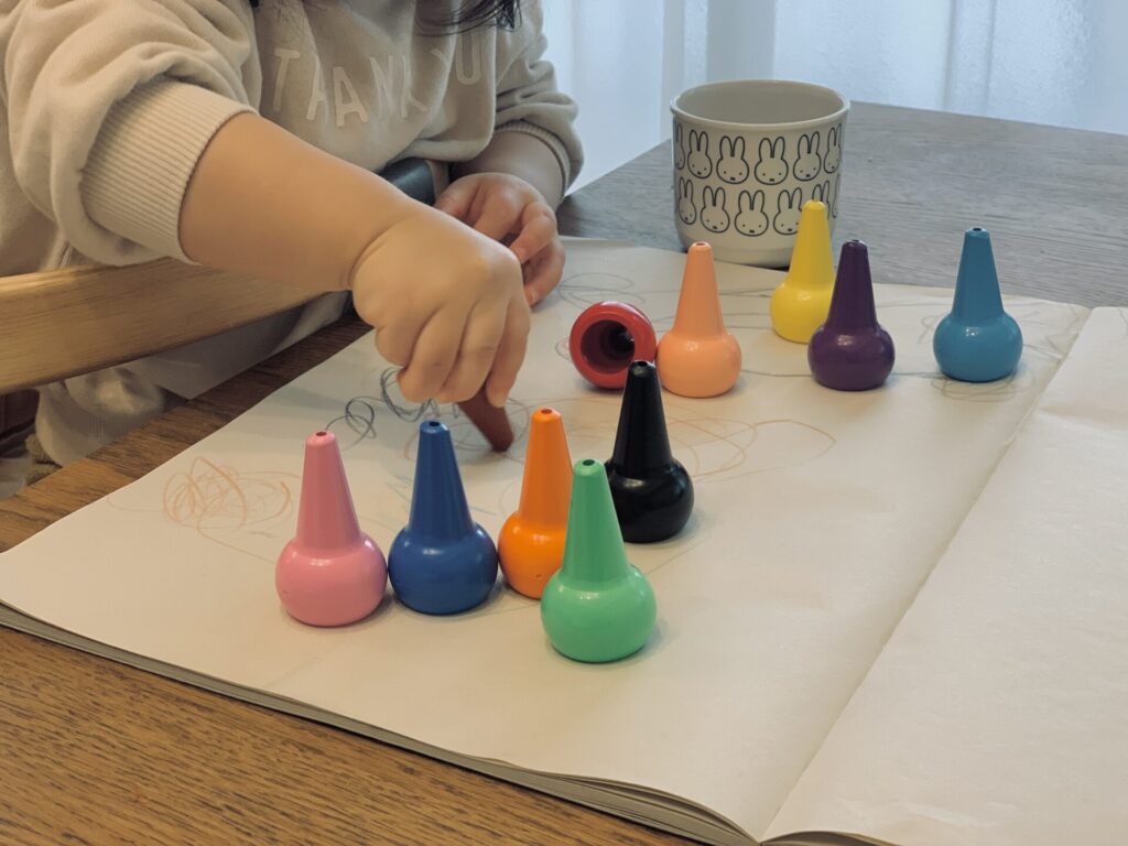2歳半〜3歳頃になると、線を描きたい・色を濃く出したいという欲が出てくるので、その頃から普通のクレヨンへ移行する家庭も多いと思います。